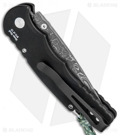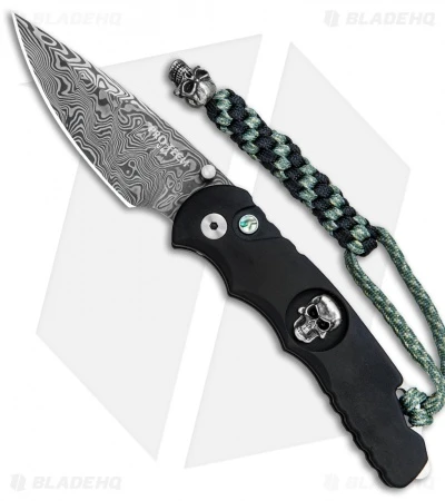 This TR-5 model has a black anodized aluminum handle featuring a Shaw Sterling Skull with a mother of pearl button and a damascus blade. It has a two-tone back spacer/lanyard attachment, and a deep carry tip-up pocket clip.